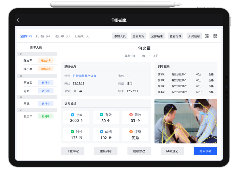 运用AI人体姿态识别技术实现运动姿态的实时分析,实时收集并分析学生动作规范度、力量输出、体能状况等运动数据。分析数据实时上传至平台,教师及管理端可随时查看训考分析实况,实现训练数据的实时监控。