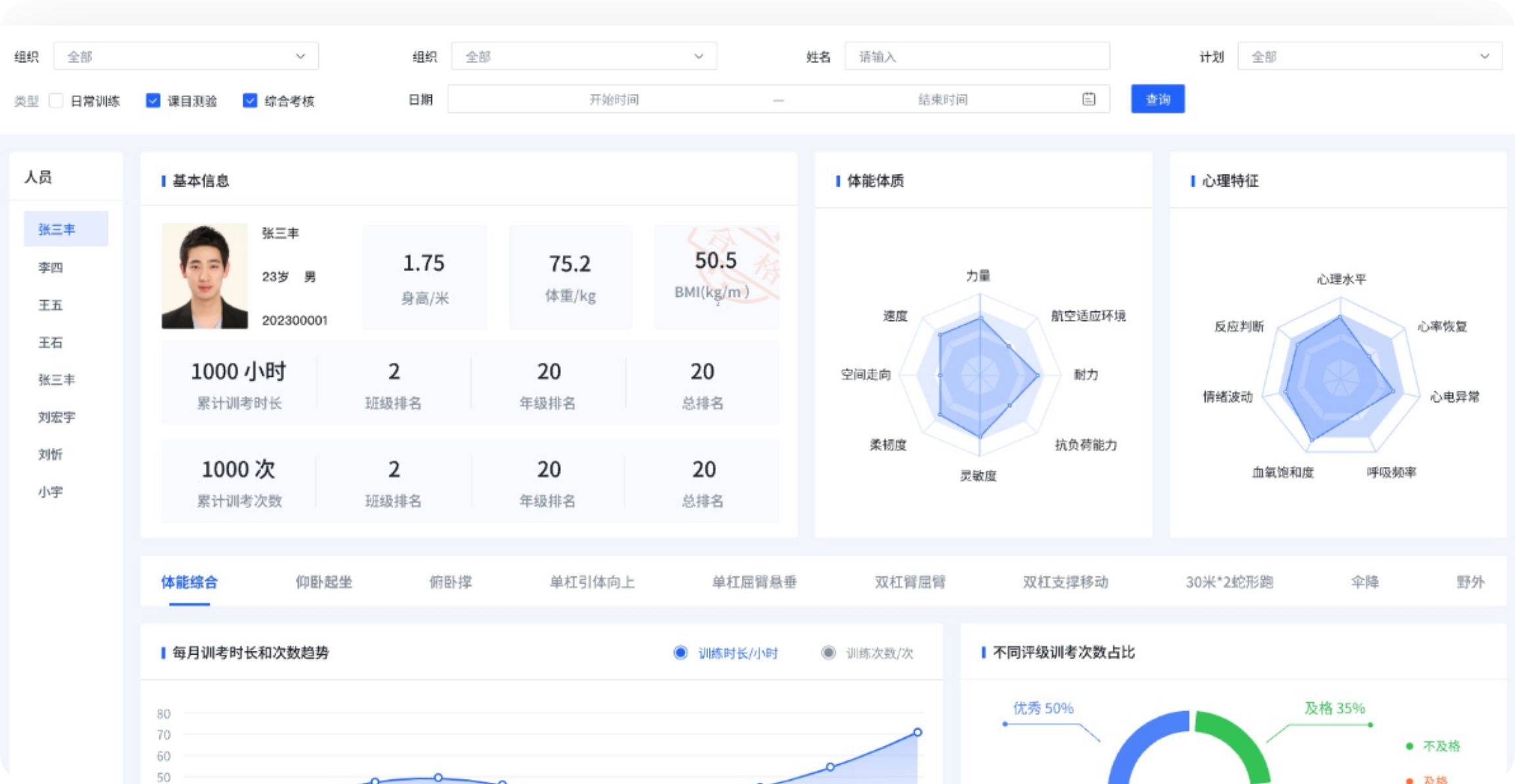 系统收集并深度分析速度、力量、耐力、灵活性等运动数据,全面评估人员的体能状态和训练效果,发掘人员的优势和不足,预测人员的发展趋势,提供个性化的训练计划,并为领导辅助决策提供数据支撑。